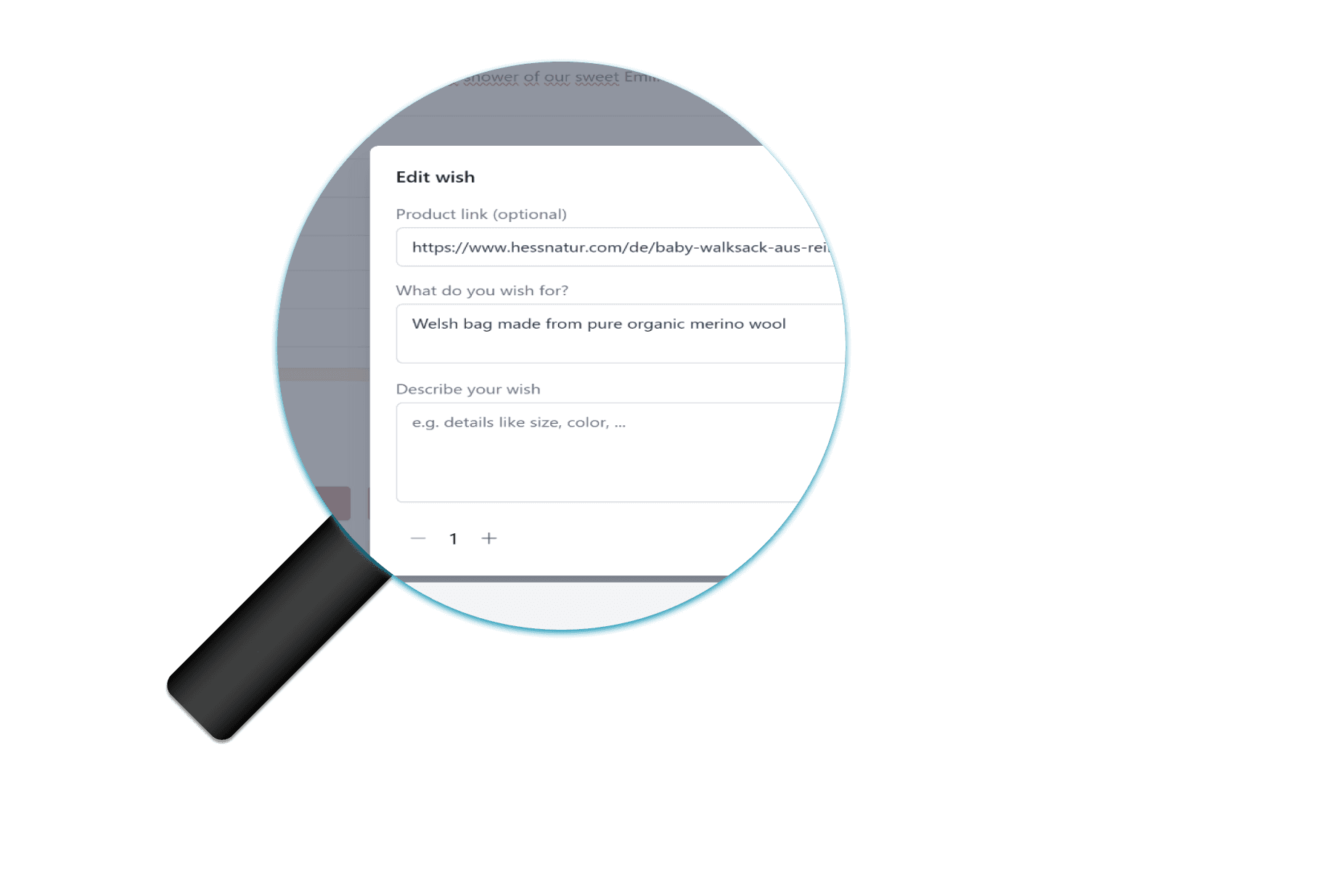 You can add as many products from online shops as you like to your Wishlist. We support a large number of different shops and the number is constantly growing! In addition to the name of the product, a photo is also displayed for your wishes. We determine this information automatically, you don't have to enter it manually! This way you can create a Wishlist for your birth in no time.